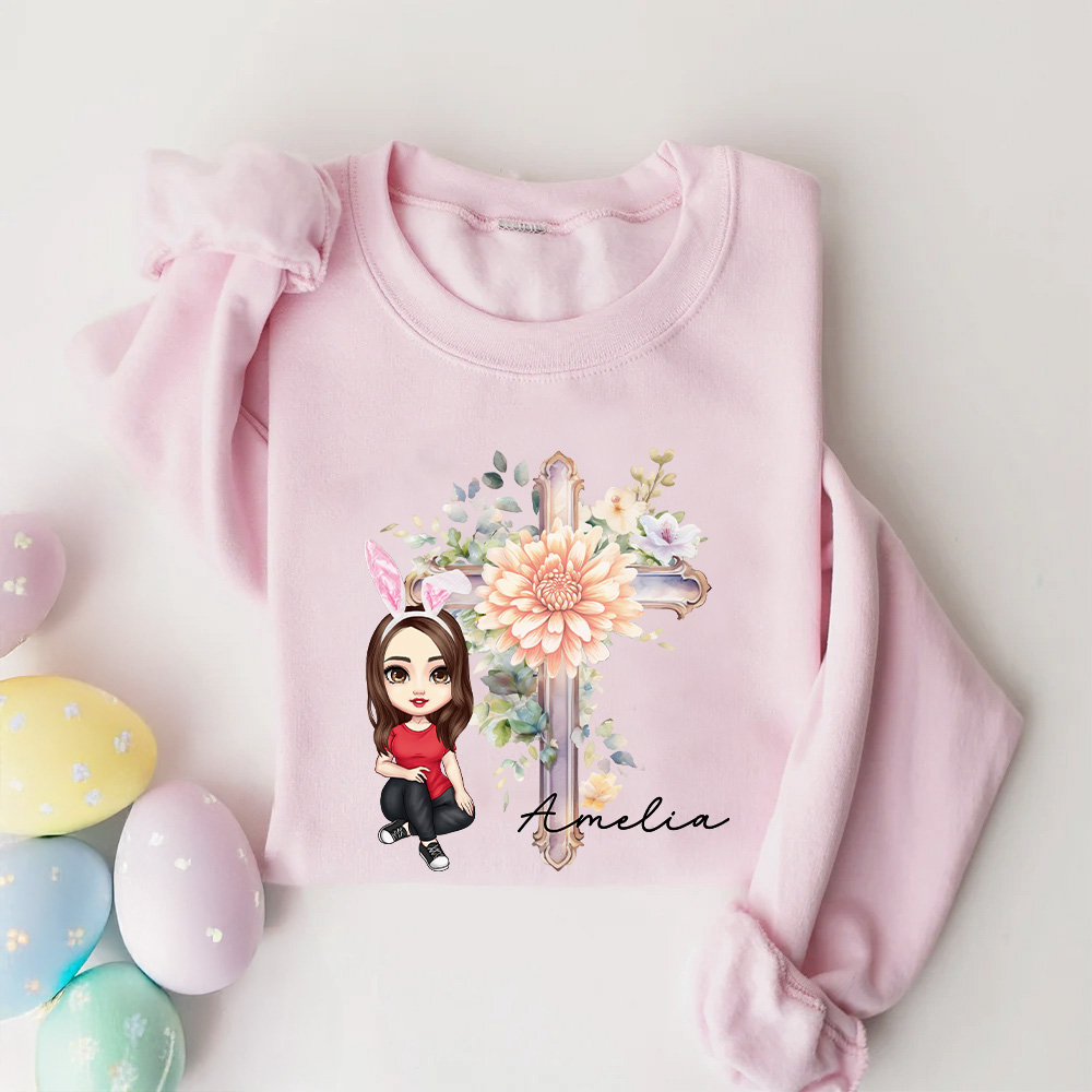 | Style | Personalized Cross Birth Flower Cartoon Character T-Shirt/Sweatshirt with Name and Bunny Ear |