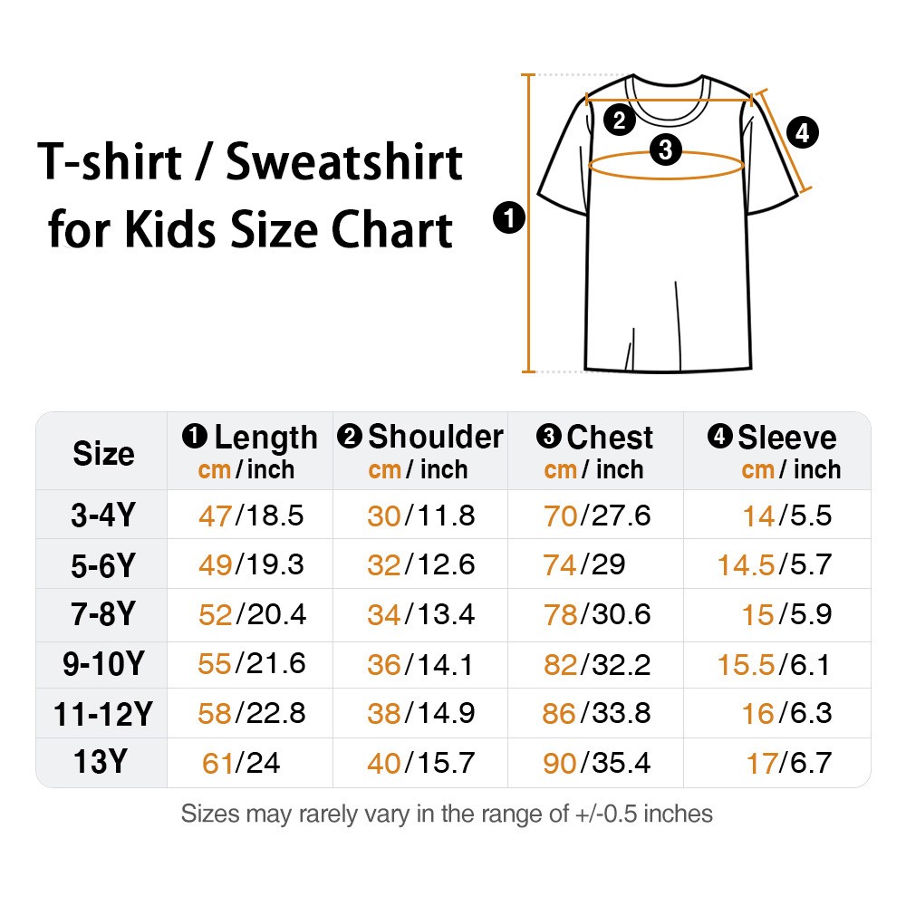 | Measurements | Adult T-shirt: XXS, XS, S, M, L, XL, 2XL, 3XL, 4XL, 5XL; Adult Sweatshirt: XXS, XS, S, M, L, XL, 2XL, 3XL; Kid T-shirt/Sweatshirt: 3-4Y, 5-6Y, 7-8Y, 9-10Y, 11-12Y, 13Y |